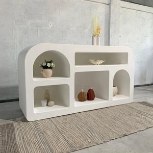 Material:Material: Constructed from a wooden frame and MDF then rendered with a white concrete epoxy mix and finished in a matt white paint